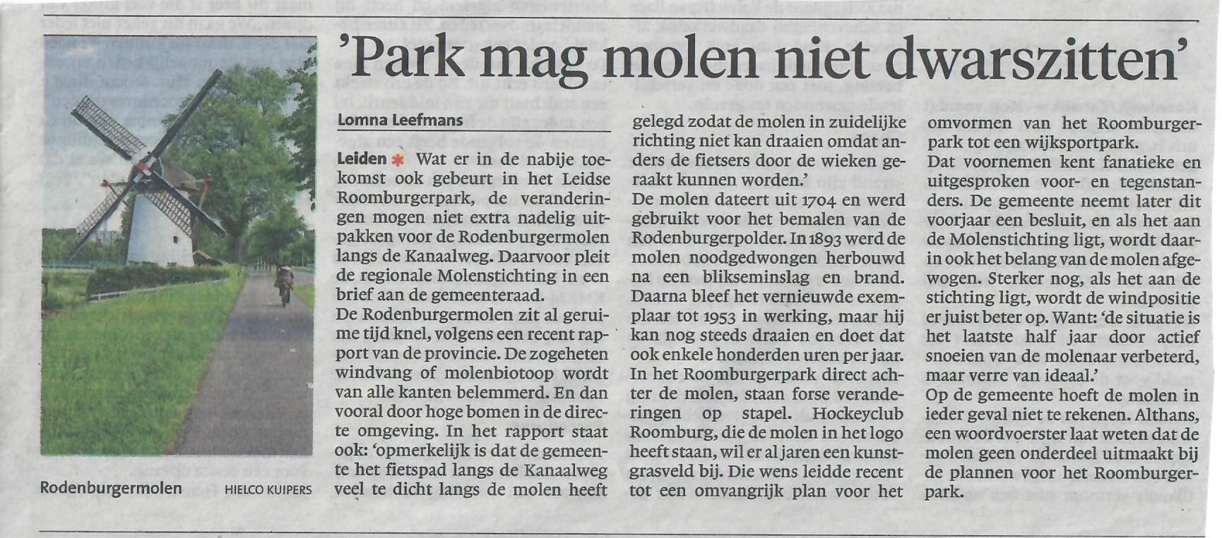 Park mag molen niet dwars zitten Leidsch Dagblad 16 mei 2019 (Klik op de afbeelding om deze te vergroten) Leidsch Dagblad 16 mei 2019