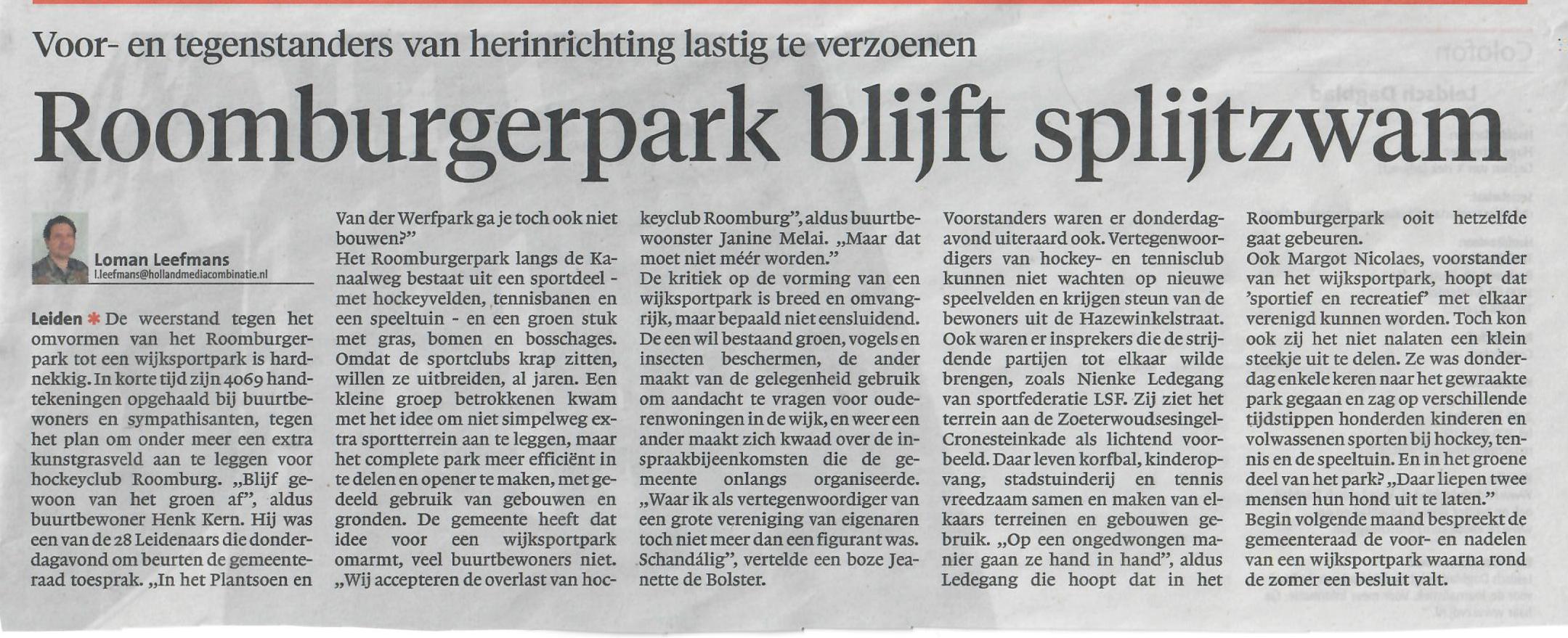 Roomburgerpark blijft splijtzwam Verslag in het Leidsch Dagblad van de inspraak op 9 mei in de Raadscommissie Onderwijs en Samenleving (Klik op de afbeelding om deze te vergroten) Leidsch Dagblad 11 mei 2019